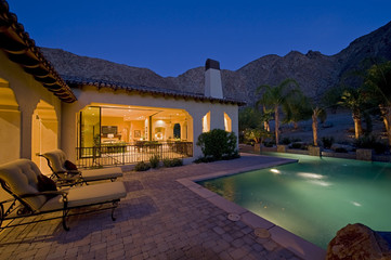 Tropical backyard garden with outdoor lighting, emphasizing landscape illumination for evening ambiance