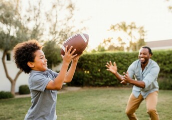 A diverse family playing football in the backyard, smiling and having fun. Concept for family bonding and outdoor activities