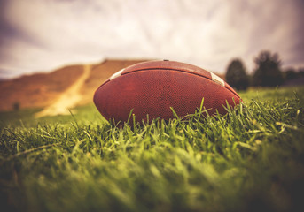 a brown american football lying on green grass in a field with a hill and trees in the background toned with a retro vintage instagram filter app or action effect
