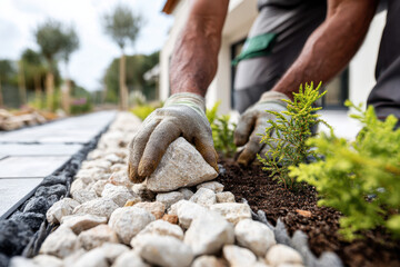 The master in work gloves lays paving stones in layers. Garden brick pathway paving by professional paver worker. Laying gray concrete paving slabs in house courtyard on sand foundation base.