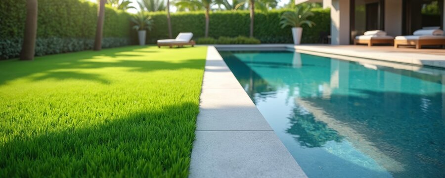 Lush green artificial grass lawn near modern swimming pool creates inviting outdoor space. Fake turf backyard design for low maintenance property, summer decor, leisure zone and comfort.