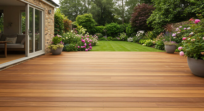 Beautiful modern backyard with wooden deck surrounded by lush greenery, perfect for relaxation and outdoor gatherings in a serene, natural setting.