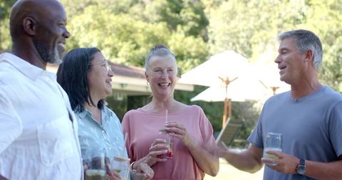 Diverse friends enjoy fruit drinks in sunny backyard gathering