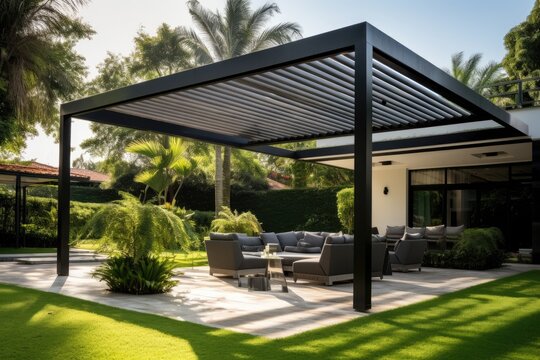 A fashionable and modern outdoor structure designed to provide shade in a patio area, such as a pergola or awning, along with a roof to cover the space. It includes a comfortable seating area