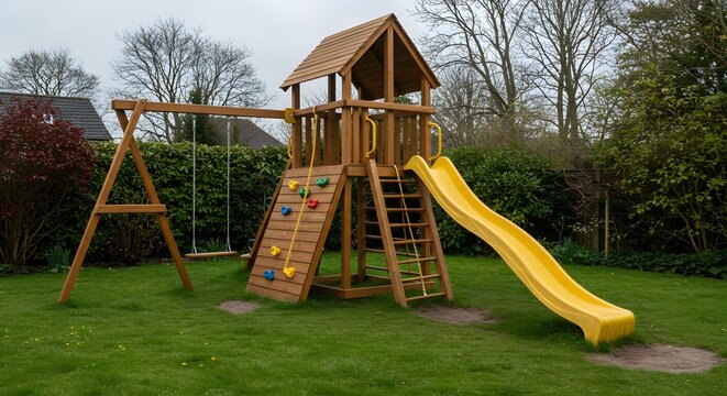 Colorful Outdoor Playground Equipment with Slides and Towers in Park on a Cloudy Day