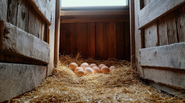 A row of eggs are sitting on straw in a barn