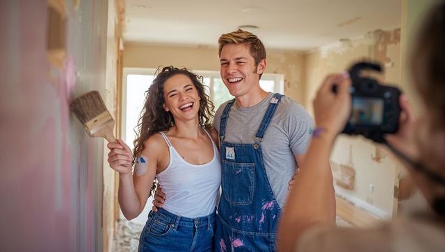 Backlit young couple renovating home holding hands wearing safety goggles showing ring
