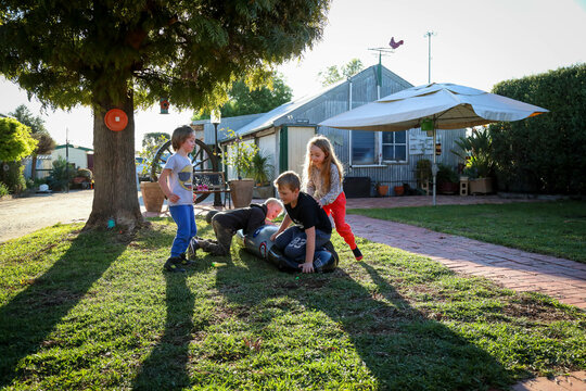 Happy cousins having fun together in Australian backyard