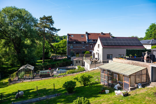 Houses, backyards and DIY hobby sheds in Dworp, Flemish Brabant, Belgium