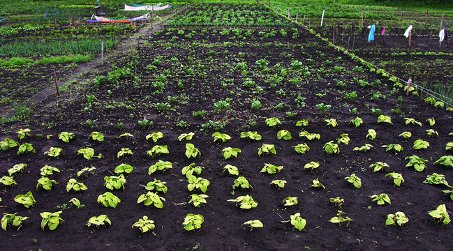 Young fresh green bean plants in a vegetable garden planted in neat rows n rich fertile soil