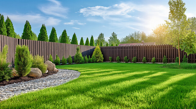 Scenic suburban backyard with wooden fence at sunset