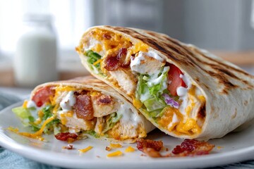 Bowls of Loaded Baked Potato Soup Topped with Sour Cream, Cheddar Cheese, Bacon, and Chives: Creamy potato soup garnished with sour cream, shredded cheese, bacon bits, and chives