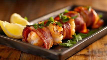 Delicious shrimp wrapped in crisp bacon garnished with parsley on an elegant platter, creating an appetizing and savory presentation for gourmet dining.
