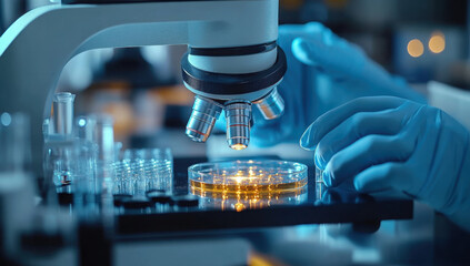 Microscopic view of petri dishes, reagents, and microlaboratory equipment in a clean and modern laboratory setting, focusing on bacteriological examination and research.