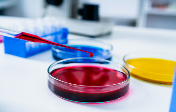 Pipette with drop of color liquid and petri dishes