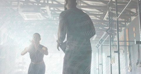 Female boxer training with coach in industrial gym showing digital binary overlay
