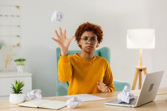 Start up business concept. Sad african business woman writing document crumpled paper and tossed it. Proposed project failed. Tired overworked girl no idea sitting at workplace writing notes at office