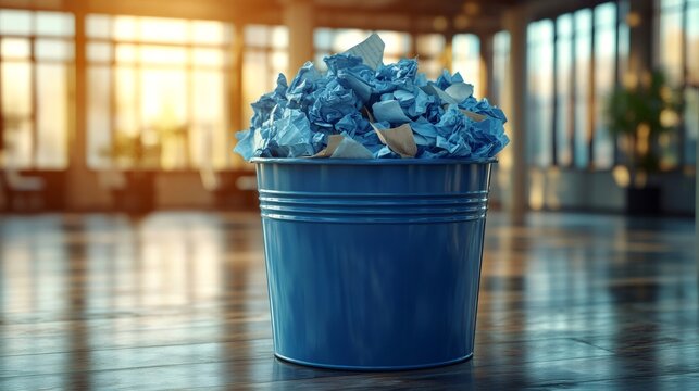 Blue metal bucket full of crumpled paper in a modern office representing bad ideas