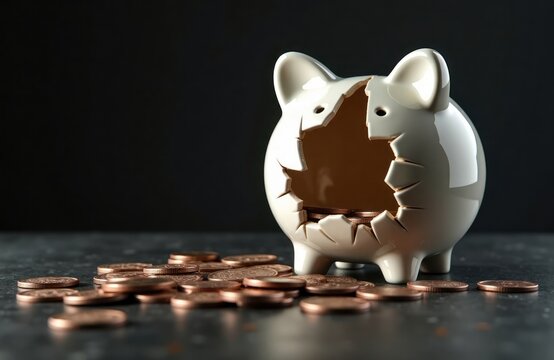 Broken piggy bank empty space, scattered coins. Ceramic pieces around opening. Financial loss bad investment concept. Dark background. Represents savings investment failure. Suitable for finance