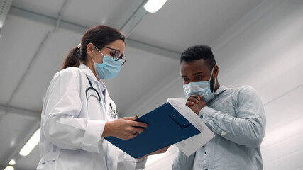 Doctor discussing test results with young patient in hospital hallway