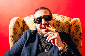 Happy man with cigar in mouth in an armchair in a studio