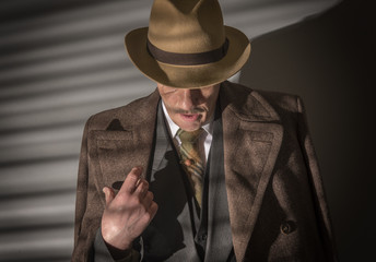 Mature man dressed as a 1940s gangster, on a grey background