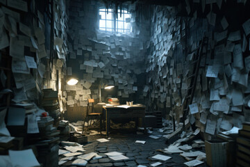 A room adorned with disheveled papers filled with erratic handwriting, portraying the chaos of unfiltered thoughts within the realm of madness. Concept of cognitive disarray. Generative Ai.