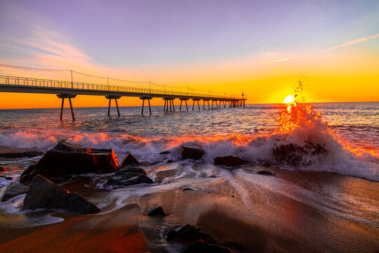 Pont del petroli Bridge that goes into the sea at sunrise, Badalona, Spain