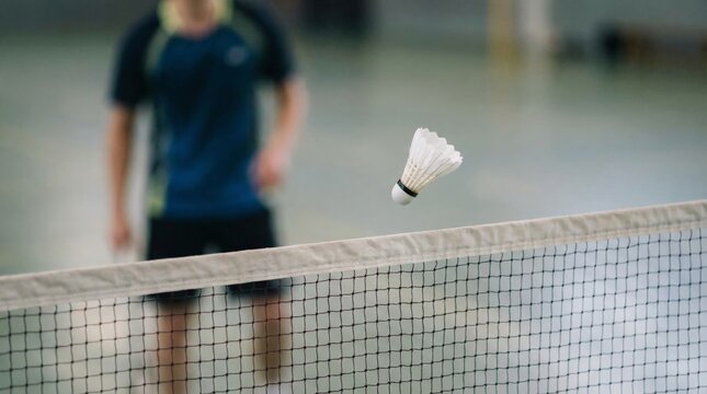 Shuttlecock is flying over the top of a badminton net during a game, with an out of focus player standing on the court in the background, showing sports and activity