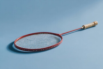 capture meticulously arranged closeup of badminton racket on clean minimalist background