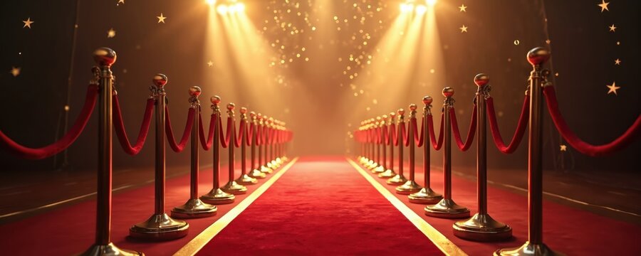 Red carpet event entrance. Golden stanchions with velvet ropes lead path. Ceremony, premiere, awards, gala, success. Luxury VIP entrance. Hollywood, show business, celebrity party.