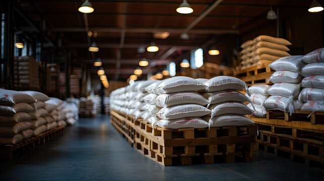 raw coffee pouring from a handful in a bag, against background of a warehouse, closeup side view
