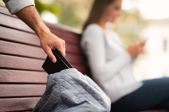 Thief Stealing Wallet From Girl's Bag In Park, Cropped, Closeup