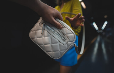 Thief hand  snatching the bag  from woman. Concept, Criminal pickpocket and crimes. Snatcher stealing  handbag. Steal  money wallet from other people, type of crime.  A thief who picks pockets.