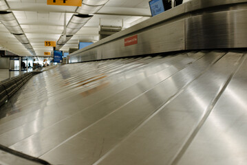 Airport baggage carousel conveyor belt concept. Luggage on a carousel in an airport terminal with a blurred background