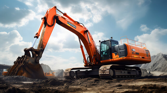 Bagger arbeitet auf einer Baustelle mit Erdarbeiten - FOTOMONTAGE