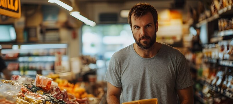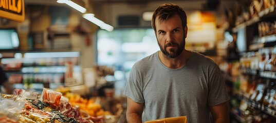A grocery bagger working behind the counter in a busy store, with space for a logo