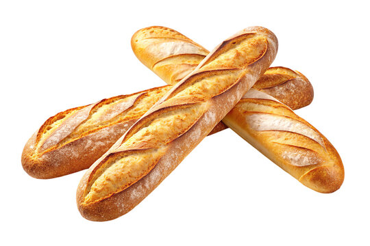 Three golden brown baguettes freshly baked crisp crust rustic charm on on transparent background