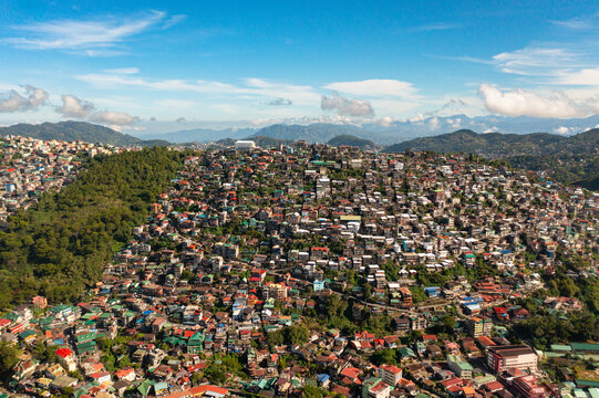 Aerial drone of Baguio City with colorful houses in a mountainous province. Philippines, Luzon.