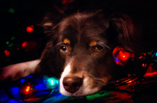 Australian Shepherd dog with Christmas lights, concept of seasonal depression, bah humbug mood, holiday pets