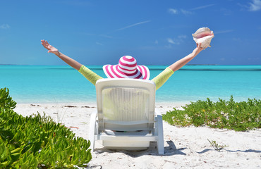Girl with a shell on the sunbed looking to the ocean. Exuma, Bah