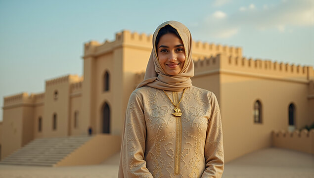 Young Bahraini woman in traditional abaya standing in front of Arad Fort