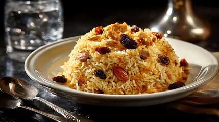 Bahraini Machboos isolated on an elegant round white plate, aromatic rice with golden chicken