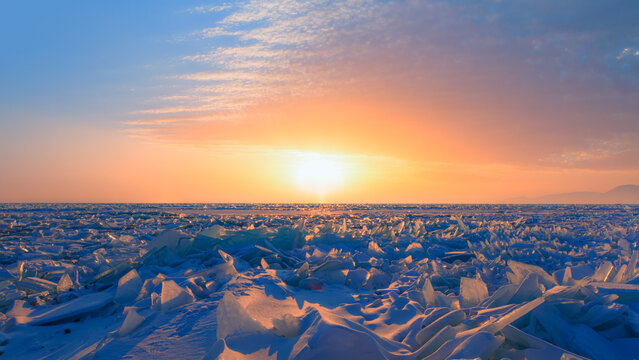 Blue ice with snow on Baikal lake at sunrise. Khoboy cape of Olkhon island, Baikal, Siberia, Russia