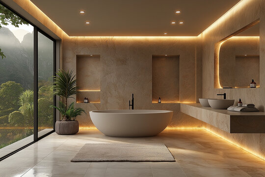 Photographie immobilière d’une salle de bain moderne spacieuse avec des murs en pierre naturelle, un éclairage encastré et une esthétique minimaliste. HDR, 3D, design, tendance, architecte