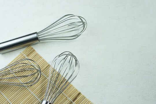 whisk placed on Thin white on a wooden stand. On the background is uneven white plaster