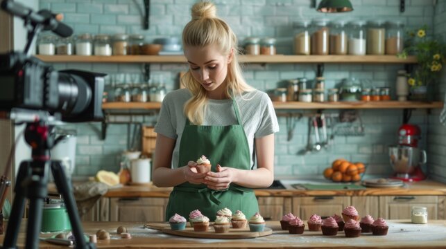 Caucasian woman recording food vlog in modern kitchen setting