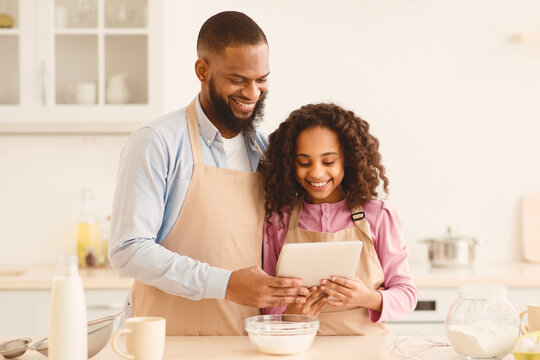 Cooking Together. Portrait of happy black father and daughter in aprons cooking in the kitchen, holding and using digital tablet, watching food video blog or reading recipe online on culinary website