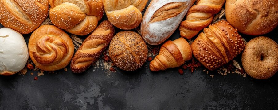 Assorted artisan breads on rustic wooden surface with copy space