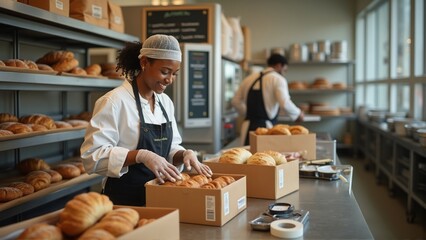 Artisan Baker Arranging Freshly Baked Loaves on Shelves in a Bustling Bakery Shop During a Sunny Afternoon